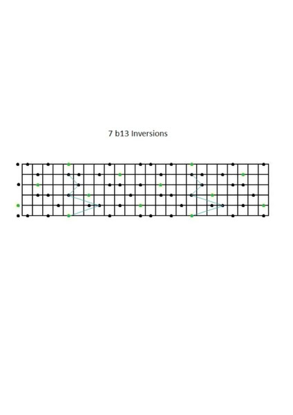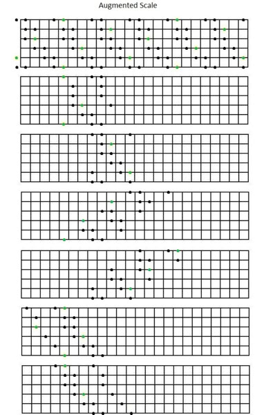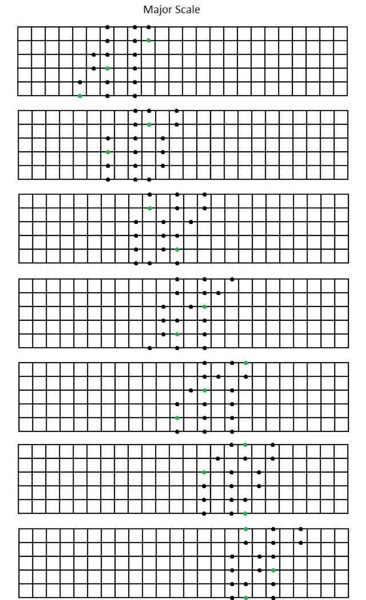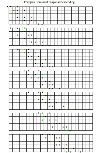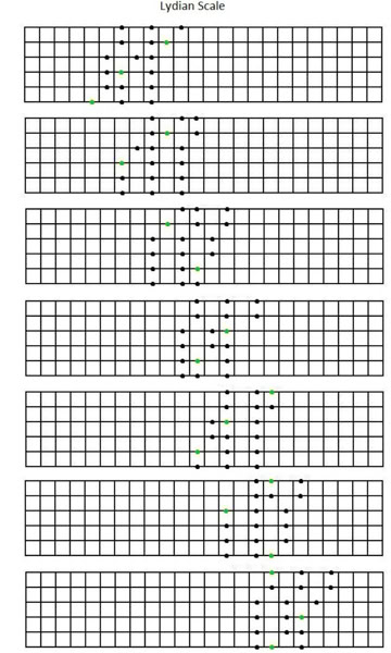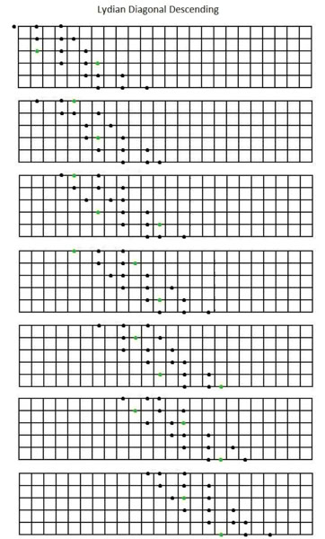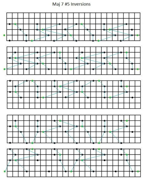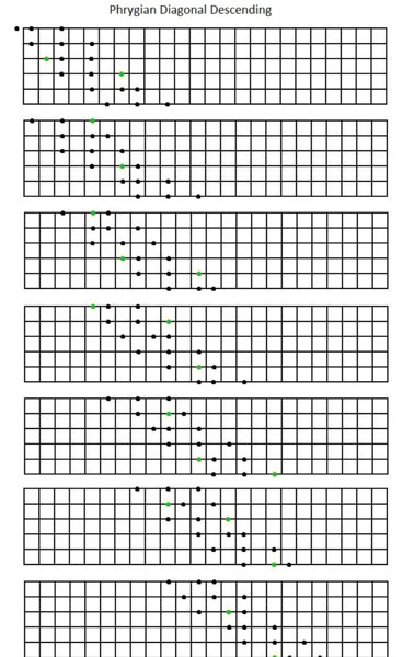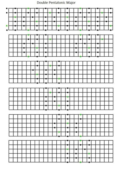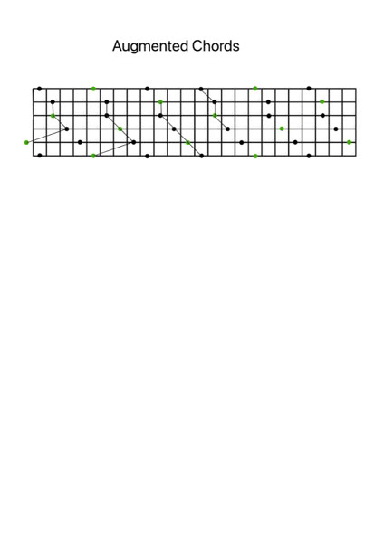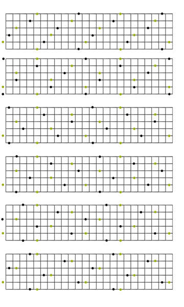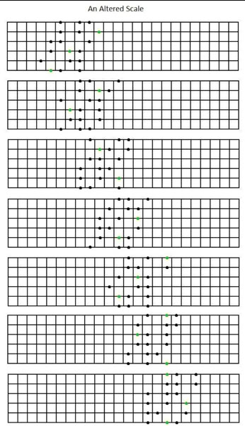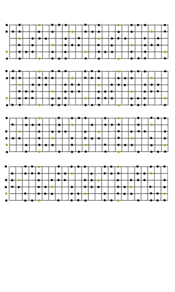 There are many things that can be researched outside of this work obviously, such as the Circle Of 4ths and Circle Of 5ths. It may be apparent that I did not indicate fret numbers, also that almost everything is in A. It is however easy enough to understand. Each green dot (in almost all of this book) is an A. A string, has A's on the open string, 12th fret, and 24th. E string, A is on the 5th fret, and 17th. D string, A is on 7th and 19th. G string, on the 2nd and 14th. B string, A is on 10th and 22nd fret. Again E string is 5th and 17th fret. It's a good idea to know notes on the neck anyway, and identify octaves, and their repetitions. I chose A because it would allow the most positions to be mapped.
