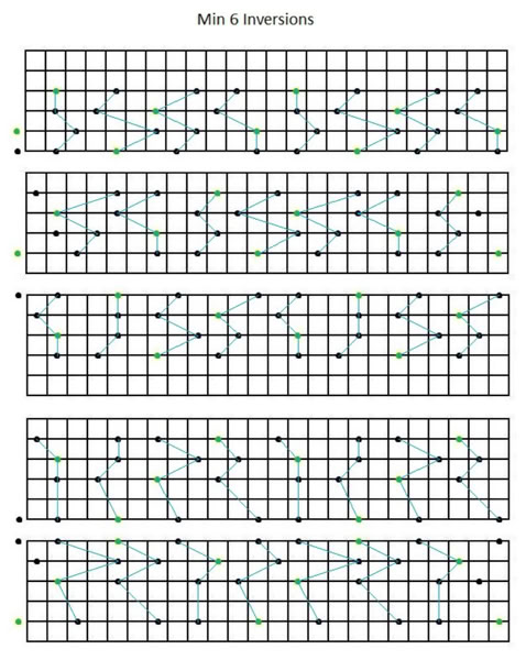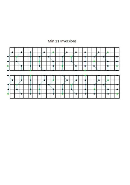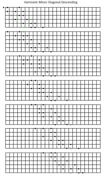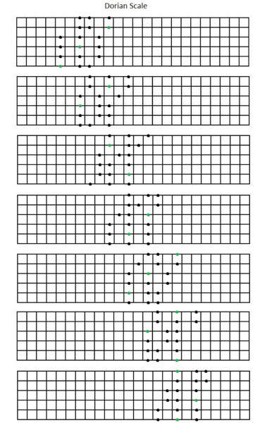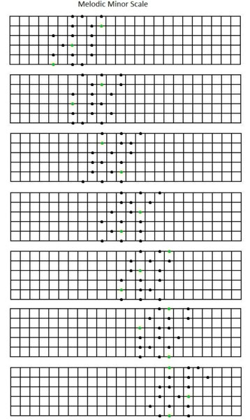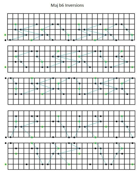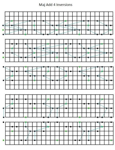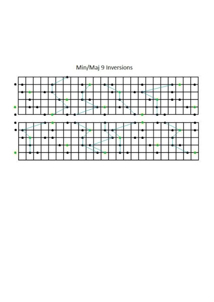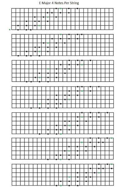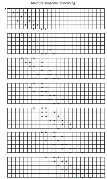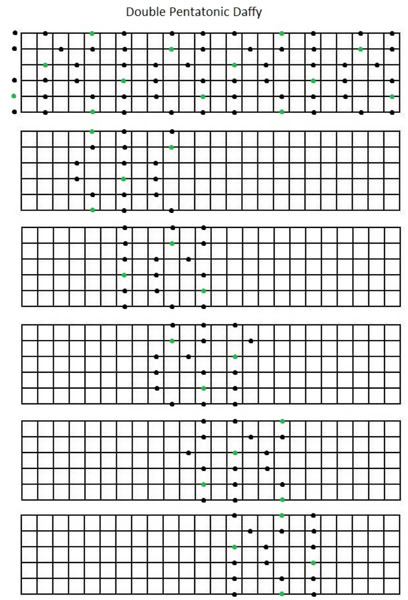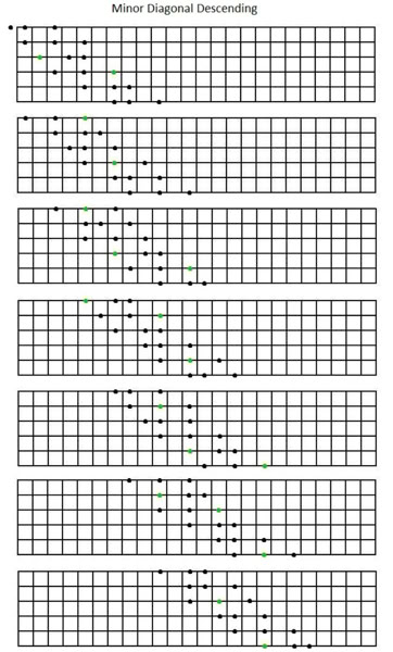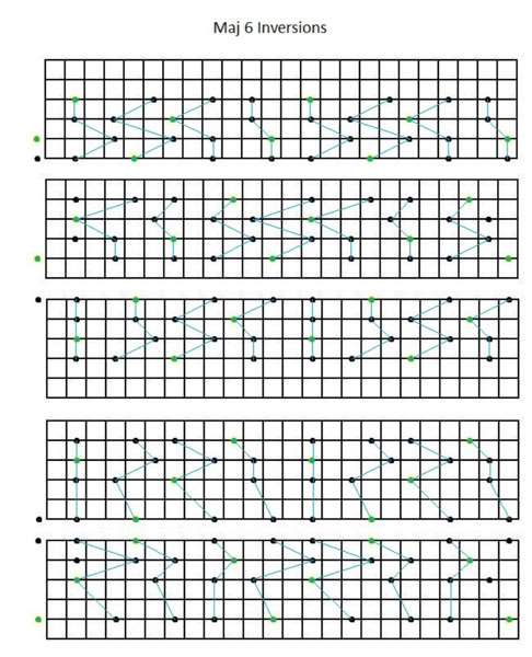 There are many things that can be researched outside of this work obviously, such as the Circle Of 4ths and Circle Of 5ths. It may be apparent that I did not indicate fret numbers, also that almost everything is in A. It is however easy enough to understand. Each green dot (in almost all of this book) is an A. A string, has A's on the open string, 12th fret, and 24th. E string, A is on the 5th fret, and 17th. D string, A is on 7th and 19th. G string, on the 2nd and 14th. B string, A is on 10th and 22nd fret. Again E string is 5th and 17th fret. It's a good idea to know notes on the neck anyway, and identify octaves, and their repetitions. I chose A because it would allow the most positions to be mapped.