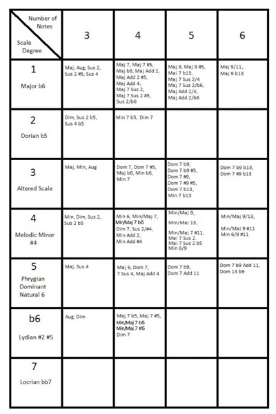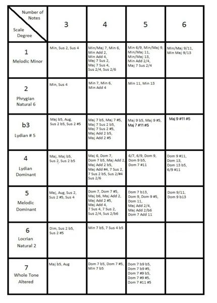In more complex areas, the “exotic” modes can be called out specifically. A clear example is, for Melodic Minor, 1 Min, Maj 7 #5 on the b3rd, Dom 7 b5 on the 4, Dom 7 #5 on the 5. Or, you could throw a Melodic Minor feel into a very basic song, with a Dom 7 b5 on the 7 of a scale. This does occur in Melodic Minor, Dom 7 b5 on the 7. It'll just sound neat.