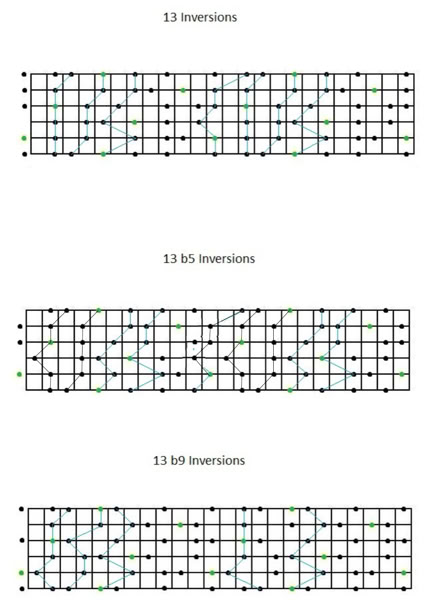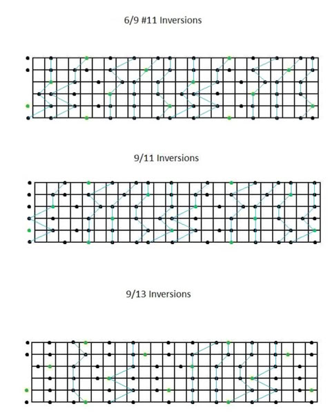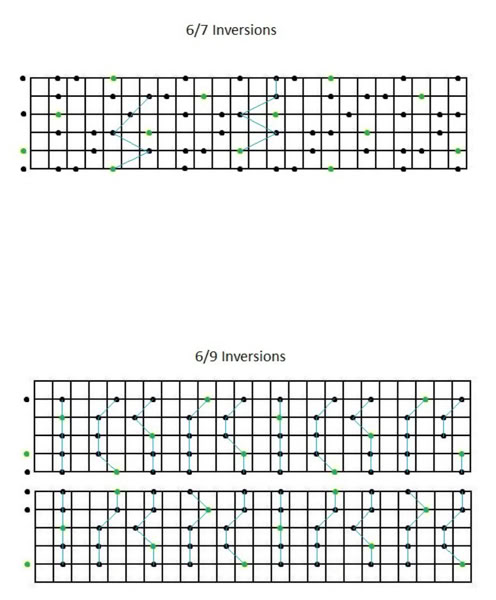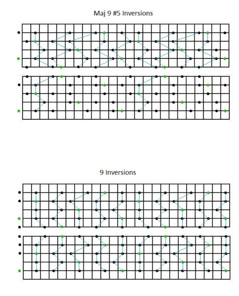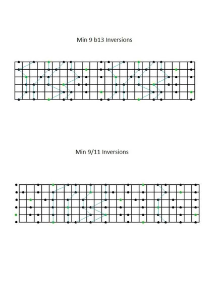 One thing that will be apparent is that I featured fewer chords than I did arpeggios. This is because some chords are physically difficult or impossible to fret. However, in the Formula Lists section, I have shown 110 chord/arpeggio formulas, where I have listed chords by number of notes in the chord, and their formulas. I have also shown how they invert into one another, when they do. For example, you may know that a Min 7 inverts into a Maj 6 – this principle applies to many chord types. The Chord/Scale Tables show modes as I have named them with chords that go in each mode, again by number of notes in each chord. In this way a person can readily identify what chords may fit in what positions, and perhaps knowing inversions, can employ a lot of ideas on one spot or anywhere on the fretboard.