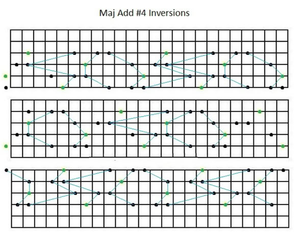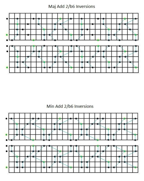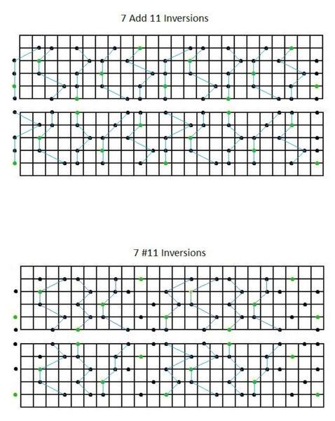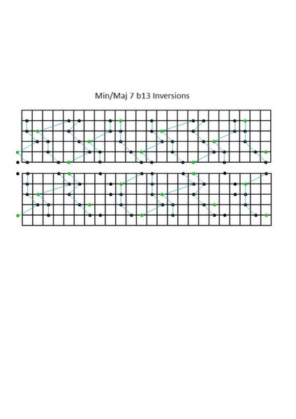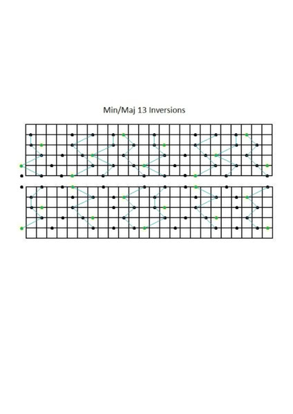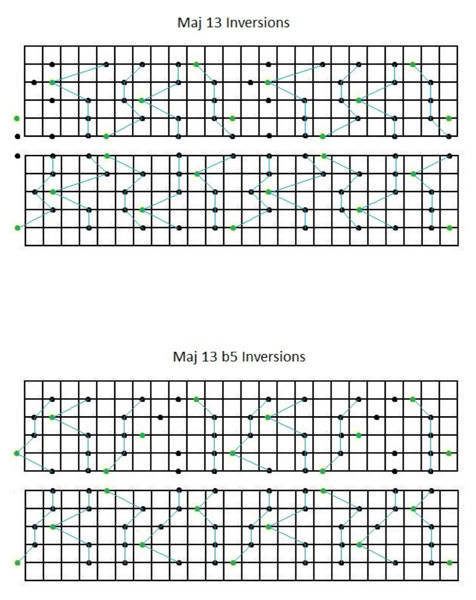Also, it can be found that some scales are also chords. For example, Pentatonic Major, Pentatonic Minor, and Pentatonic Neutral are 6/9, Min 11, and Dom 11, respectively. 9 #11 #5 is Whole Tone, and Maj 7 #9 b13 is Augmented. Also, some chords invert into one another, like Min 7 inverting into Major 6. It’s also noteworthy that the negative space of scales are shapes themselves.