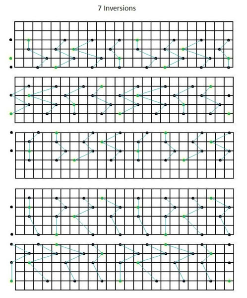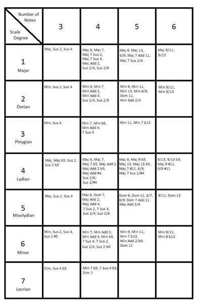 The basic formula for this entire book, as mentioned in the introduction is, every combination of the numbers 1-12, where 1 and 7 or 8, or 9, are constants, and there are never three consecutive numbers. Then notes can be removed or added. Every chord/arpeggio/scale/mode has a 5th, be it natural flat or sharp.